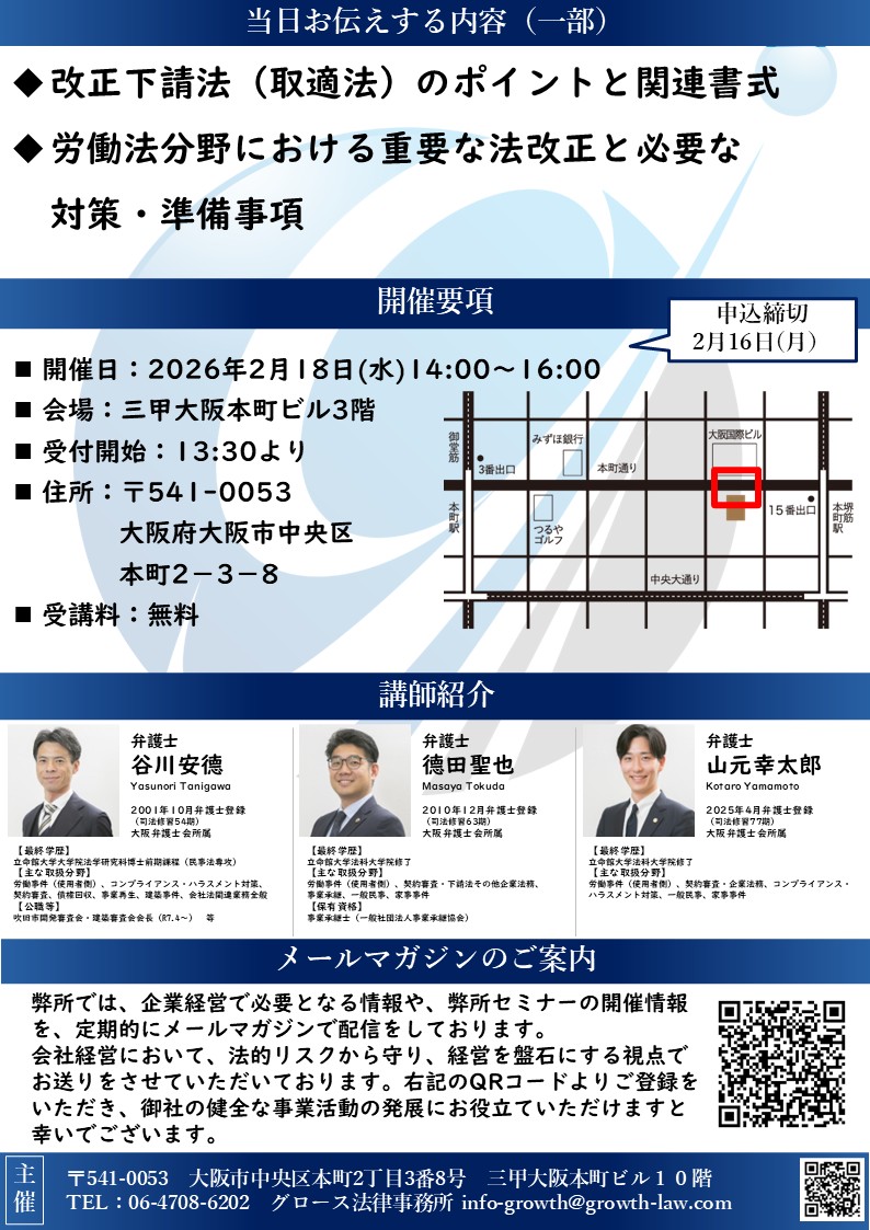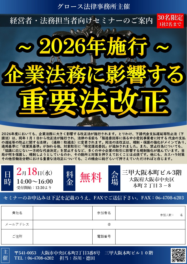 2026年度においても、企業法務に大きく影響する改正法が施行されます。とりわけ、下請代金支払遅延等防止法(下請法)は、同年1月1日から改正法が施行され、法律の名前も「製造委託等に係る中小受託事業者に対する 代金の支払の遅延等の防止に関する法律」(通称:取適法)に変更されます。同法の法改正は、規制・保護の強化がメインであり、適用基準に「従業員基準」が加わる他、対象取引に「特定運送委託」が追加されました。また、禁止行為についても、「協議に応じない一方的な代金決定」を禁止するなど、多くの中小企業の取引に影響する規制強化が進んでいます。当局が何を保護し、規制しようとしているのか、その勘所と対策を押さえておくことは必須です。他にも、カスハラ対策その他労働法分野における重要な法改正についても、この機会に総ざらいで押さえていただければと存じます。